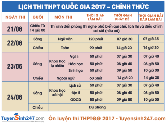 Lịch thi kỳ thi THPT quốc gia 2017 như sau: